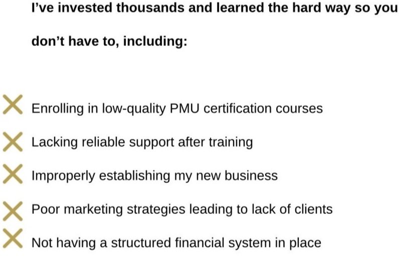 Learn from my experience to avoid costly mistakes and fast-track your success with my all-in-one PMU Business in a Box!